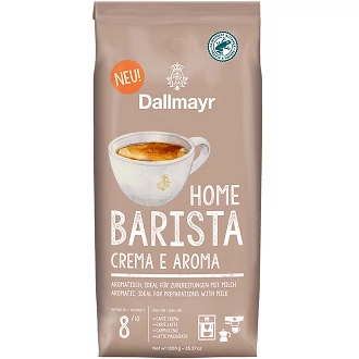 A Home Barista család új tagja erős és aromás. A fenntartható gazdaságokból származó válogatott kávébab finom, hosszú és sötét pörkölési folyamaton megy keresztül. Krémes állagának köszönhetően a Crema e Aroma kávé ideális minden tejes kávéitalhoz.